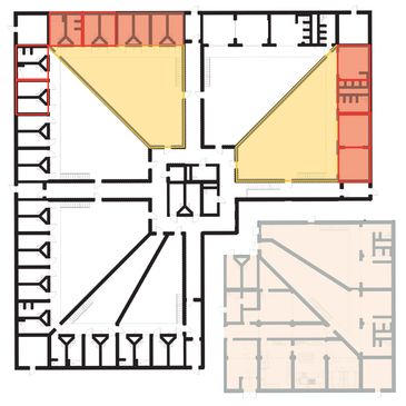 The layout uses a flexible concentric, think “apple pie”, approach to maximize staff efficiency and safety. The layout allows smaller clusters of inmates to improve to improve separation and classification. The control is in the middle of the “pie”, with direct views into all pie “slices”.